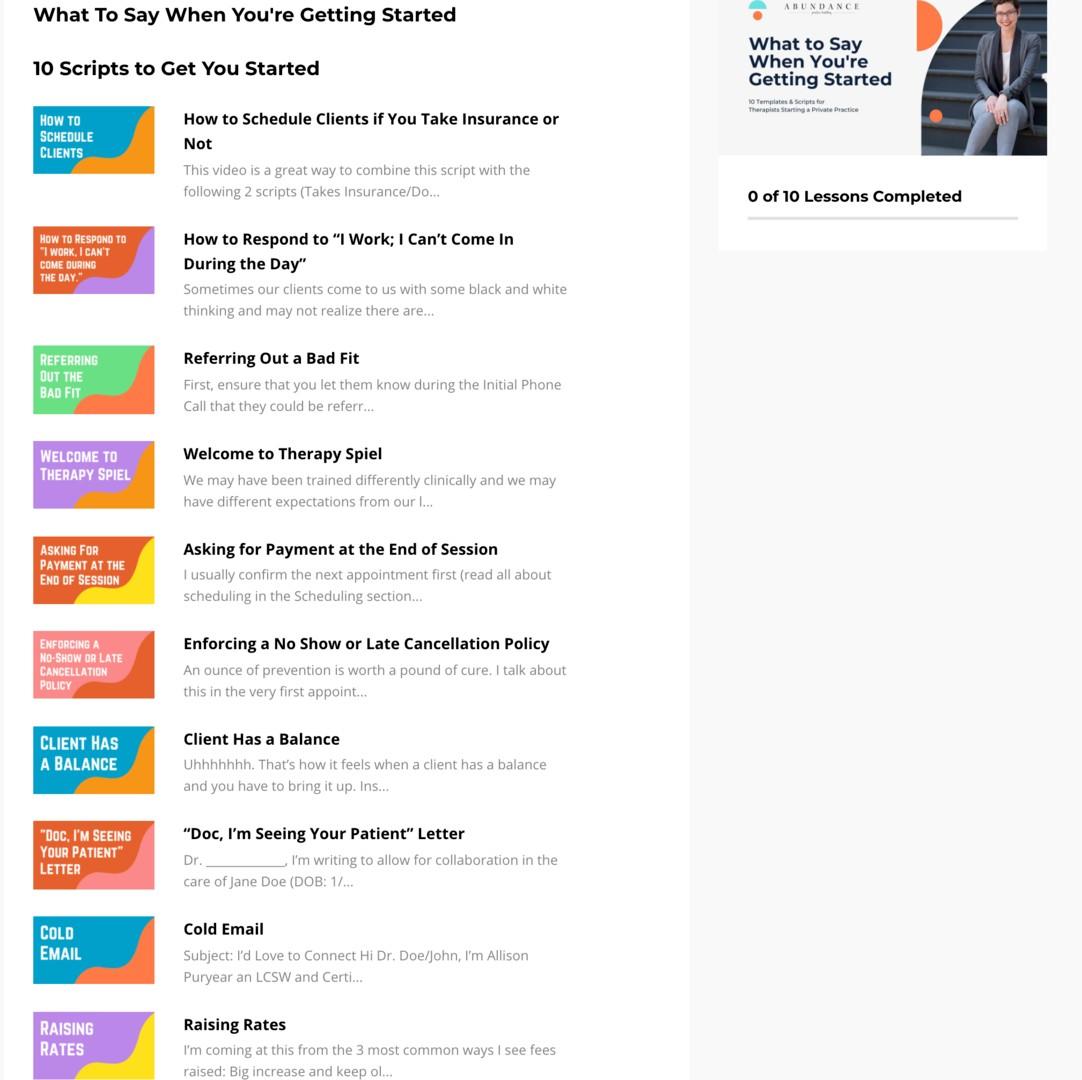 I see how therapists, who are so good at finding the right thing to say in response to trauma, loss, and panic, trip over their words when it comes to the business stuff. We weren’t trained in this. We have some “stuff” to work out around it. And while you’re doing all that, I wanted to create scripts so you can get clients in the door in the meantime. Doing good clinical work always makes me feel more confident and I’m hoping that getting clients in the door so you can do your solid clinical work can bolster that ego and the guidance in the scripts can bolster your practice.